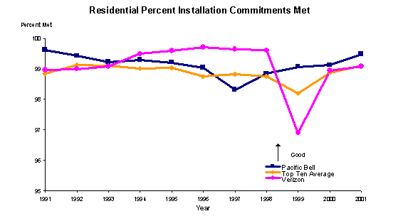 Other than in 1999, when Verizon's percentage of residential commitments met dipped to below 97%, Verizon performed well during the 1991-2001 period on its residential commitments. Its performance did not vary much from Pacific's, and neither party shows major problems in the "commitments met" area during the 1991-2001 period.