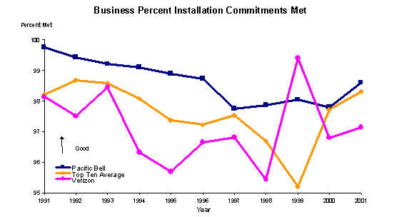 Pacific's residential installation "commitments met" data were consistently good from 1991-2001, with the exception of a dip in "commitments met" in late 1997. For business customers, the percentage of commitments met declined notably from 1991 through 1997, improving again in 2001. Pacific has demonstrated a slight downward trend for its residential lines but it is not statistically significant while it has shown a slight deterioration for business lines.150 Its performance is not statistically different than the reference group for the residential lines but it is better for the business lines.151