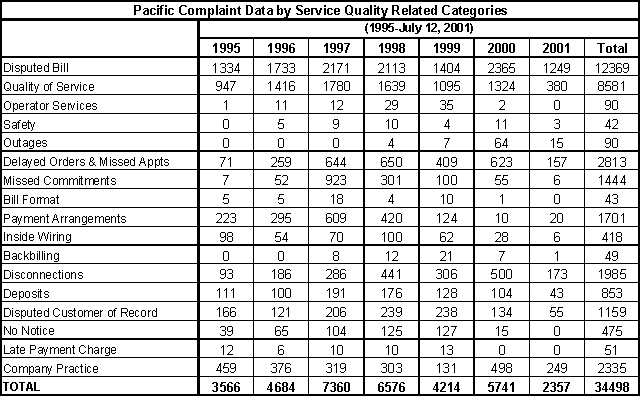 In the OII initiating this proceeding, the Commission listed informal complaint data for Pacific Bell in Appendix C, as follows: