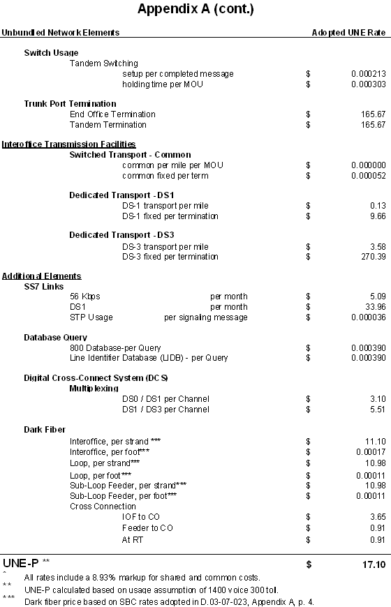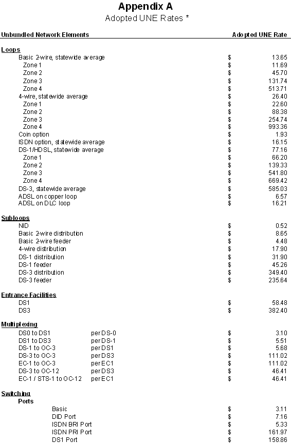 1. The recurring prices for unbundled network elements (UNEs) offered by Verizon California (Verizon) that are set forth in Appendices A and B to this decision satisfy the requirements of Sections 251(c)(2), 251(c)(3), and 252(d)(1) of the Telecommunications Act of 1996 and are hereby adopted.