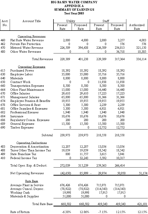 The Water Division (Division) made an independent analysis of BBWC's summary of earnings and issued its report in November 2004. Appendix A shows BBWC's and the Division's estimates of the summary of earnings at present, requested, recommended and authorized rates. Appendix A also shows differences in BBWC's and the Division's estimates in operating revenues, expenses, and rate base. BBWC was informed of the Division's differing views of revenues, expenses, and rate base. BBWC agrees with the Division's findings.