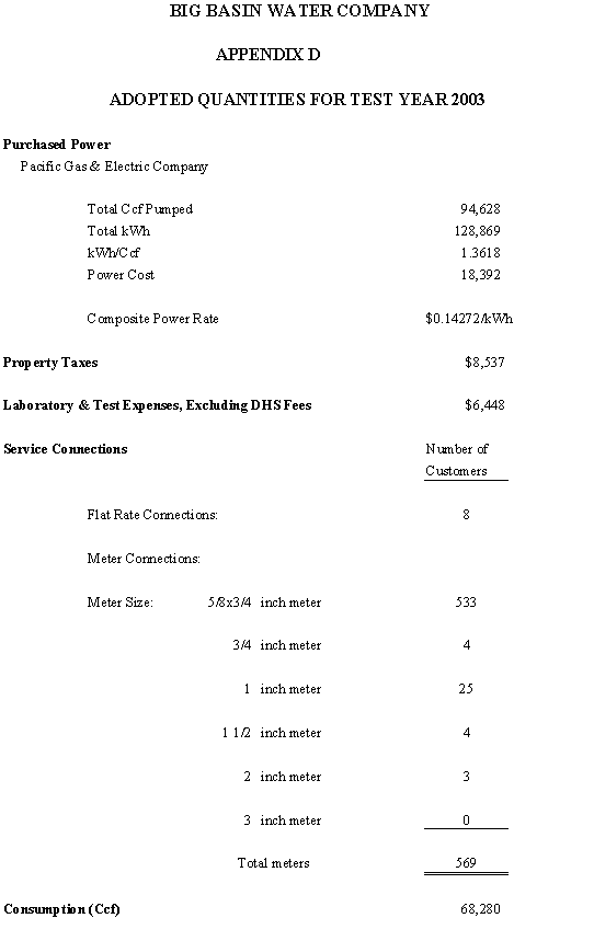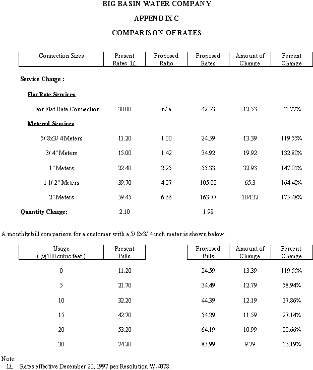 The present rates became effective on June 9, 2004, pursuant to pursuant to Res. W-4475, which authorized an interim general rate increase, subject to refund producing additional gross revenue of $30,000 or 12.5%. The increase authorized in this resolution replaces the interim rate increase. The last general rate increase was granted on November 19, 1997, pursuant to Res. W-4078, which authorized a general rate increase of $41,219, or 24.27% resulting in a rate of margin of 20% for Test Year 1997.