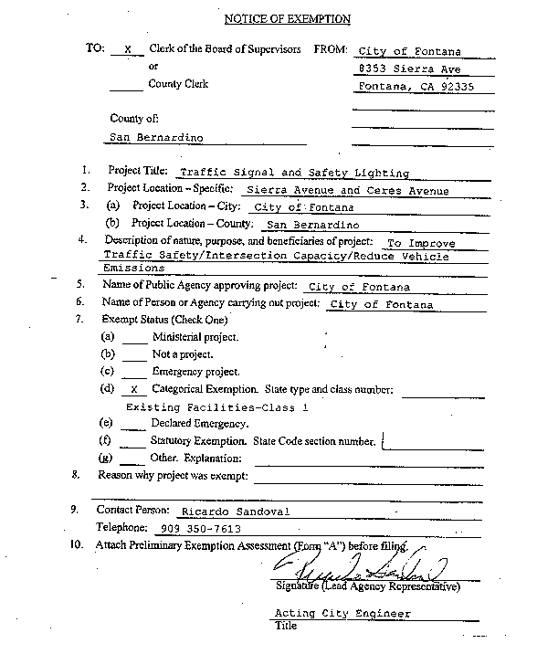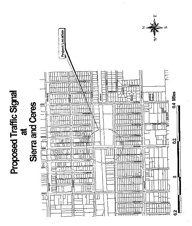 City proposes to install pre-signals with interconnect steel sleeving at the existing Sierra Avenue railroad grade crossing. Adjacent traffic signal locations are the vehicular intersections of Sierra Avenue at Orange Way (north of Sierra Avenue Crossing) and Sierra Avenue at Ceres Avenue (south of Sierra Avenue Crossing). The MANUAL ON UNIFORM TRAFFIC CONTROL DEVICES FOR STREETS AND HIGHWAYS (1988 Edition), published by the United States Department of Transportation Federal Highway Administration, states, "When highway intersection traffic control signals are within 200 feet of a grade crossing, control of the traffic flow should be designed to provide the vehicle operators using the crossing a measure of safety at least equal to that which existed prior to the installation of such signals." Since the adjoining traffic signals are within 200 feet of Sierra Avenue Crossing, City is justified in installing pre-signals, thereby precluding motor vehicles from queuing across the railroad tracks during average daily peak hours. Each pre-signal will consist of a traffic signal pole and mast arm with light-emitting diode (LED) indications specified by State of California Department of Transportation (Caltrans). The proposed steel sleeving is required to provide a means of installing communication media to traffic signals on both sides of Sierra Avenue Crossing.