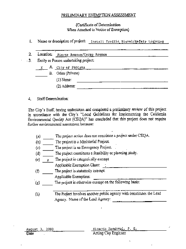 City is the lead agency for this project under California Environmental Quality Act of 1970 (CEQA), as amended, as stated in Public Resources Code Section 21000 et seq. City has determined that the project is categorically exempt from the requirements of CEQA, as amended, pursuant to the Commission's Rules of Practice and Procedure, Rule 17.1(h)(1)(A) 5,6,7 which states: