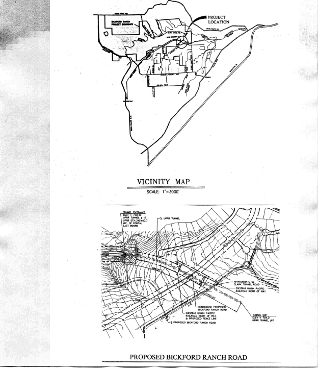 The proposed crossing, Bickford Ranch Road, is part of the Project that involves the construction of a mixed-use development that will include residential development ranging from medium density housing lots (5,000 - 7,400 square feet) to large rural estates (3.0 -10 acres). The developer plans to develop the site with a maximum of 1,950 dwelling units, a golf course, and other recreational facilities. The proposed crossing will also include a public trail for pedestrians, bicycles, and equestrian use, and will connect the residential area of the Project to Sierra College Boulevard. Sierra College Boulevard is a nearby major thoroughfare that connects local traffic to Interstate 80 and State Route 193. The proposed crossing will be constructed over the existing UPRR Clark Tunnel. The new crossing will not require any construction in the vicinity of the UPRR tracks. County states in its Application, "the proposed Overhead will not alter existing clearances for the existing railroad tunnel... and the existing Railroad operation will not be impaired during construction." Because the proposed crossing will be grade-separated, no railroad warning devices, special signs, or signals will be required.