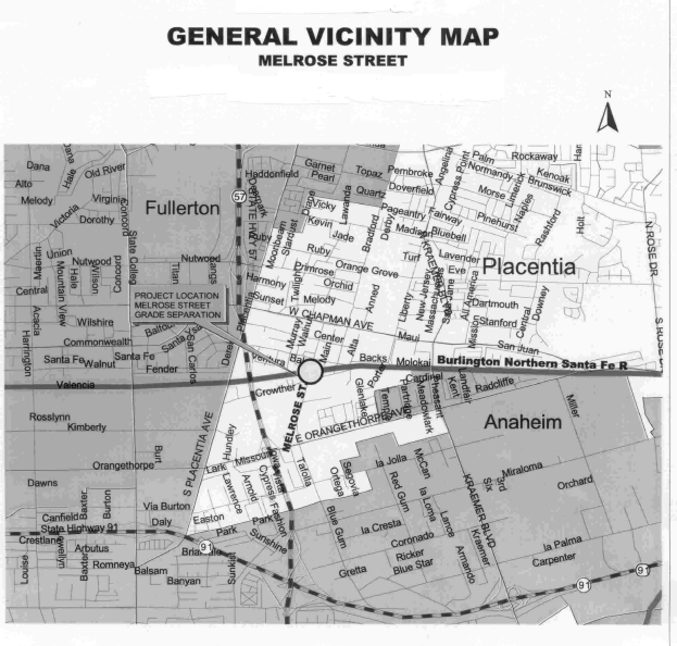 2. The City requests authority, under Public Utilities Code Sections 1201-1205, to remove the existing at-grade crossing at Melrose Street over BNSF's 2B Line, and to construct a grade-separated underpass at its current location, in the City of Placentia, Orange County.