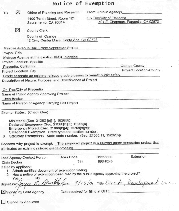On May 15, 2001 a Notice of Exemption (NOE) was mailed by the City to the Office of Planning and Research and to Orange County Clerk Office. The NOE, which is included in Appendix B, advises all interested parties that the City authorized the Melrose Street Grade Separation Project and applied the Section 21080.13 CEQA exemption.