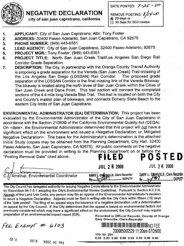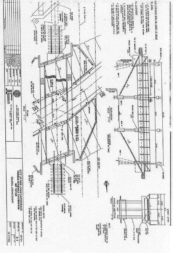 The pedestrian/bicycle underpass proposed to be built under a new railroad bridge is part of the Orange County Master Plan "Mountains to the Sea" bike trail. The trail begins at Doheny State Beach and, except for the underpass, continues approximately 15 miles upstream along San Juan Creek to the eastern City limit. OCTA provided the City with funds from its Federal Transportation Enhancement Act allocation for construction of the underpass. Ultimately, the trail will continue an additional 15 miles to Casper's Regional Park. The underpass will provide access to the downtown, schools and parks within the City. The underpass is proposed to provide the following benefits: