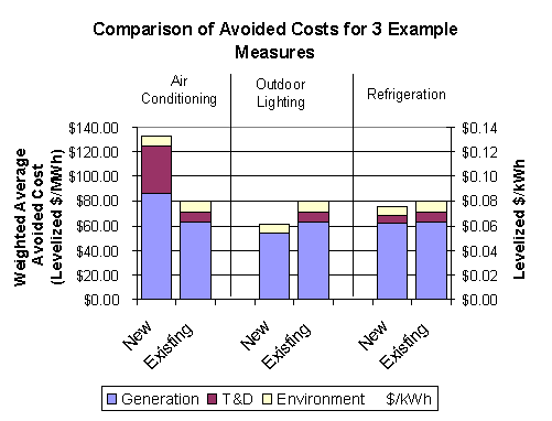 "In Figure 1, we compare the results for three example electricity efficiency measures.25 The three efficiency measures are air conditioning, outdoor lighting and refrigeration programs. The air conditioning measure (upgrade of a residential A/C [air conditioning] unit from 12 to 13 SEER) has a total avoided cost savings of $133/MWh with the new avoided costs compared to a savings of approximately $80/MWh under the existing avoided costs (this is equivalent to $0.133/kWh and $0.080/kWh as shown on the right-hand y-axis). The large differential in avoided costs under the two forecasts exists because the majority of the savings in an A/C upgrade occurs during the summer peak period when both the generation avoided cost and T&D avoided costs are highest. In contrast, the value for outdoor lighting efficiency drops under the new avoided costs from $80/MWh to approximately $61/MWh. For outdoor lighting, there is no T&D avoided cost benefit because the savings occur at times when the T&D system has excess capacity. Refrigeration, which is assumed to have a flat energy savings profile has a closer comparison under both sets of avoided costs ($75/MWh for the new avoided costs and $80/MWh in the existing avoided costs), and similar proportions of generation, T&D, and environmental avoided cost." (E3 Report, pp. 11-12.)