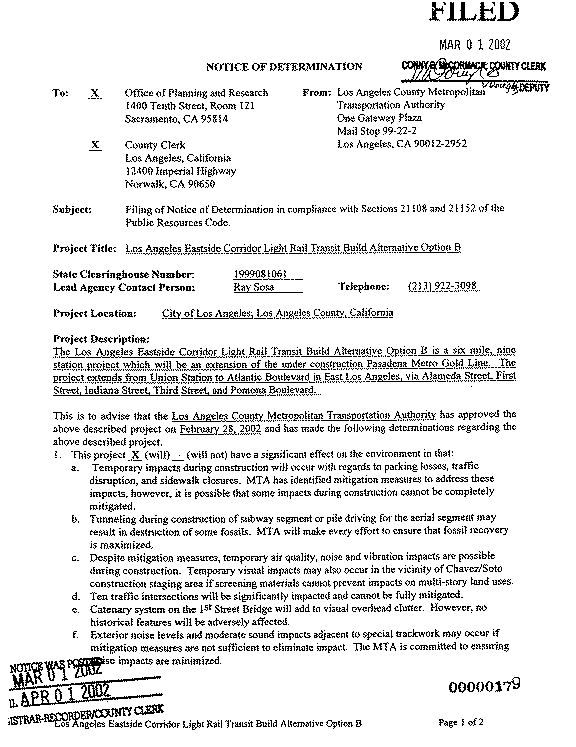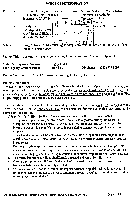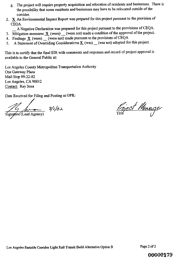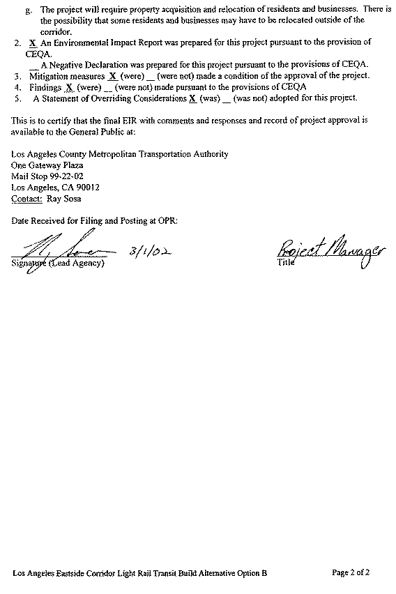 5. In approving the project on February 28, 2002, the LACMTA Board of Directors adopted the Final SEIS/SEIR for the Los Angeles Eastside Corridor (SCH No. 1999081061) and found that "The project will have a significant effect on the environment." Mitigation measures were made a condition of the approval of the project. Findings were made pursuant to the provisions of CEQA. An SOC was adopted for this project.