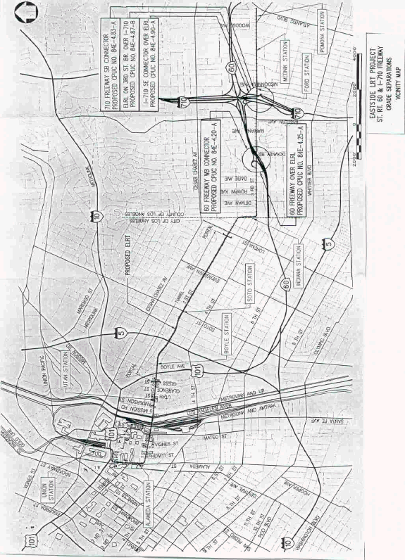 1. Los Angeles County Metropolitan Transportation Authority (LACMTA) is authorized to construct, as part of LACMTA's Eastside Corridor Light Rail Transit Line (ELRL) project, five new grade-separated highway-rail crossings. LACMTA will construct two new ELRL tracks within the median of Third Street beneath and within the existing structures of State Route (SR) 60 Freeway westbound connector, SR-60 Freeway, Interstate (I) 710 Freeway southwest connector, and I-710 Freeway southeast connector and on an existing bridge structure above I-710 Freeway, in Los Angeles County, at the locations listed in this order and substantially as described and shown by plans attached to the Application and Appendix B attached to this order.