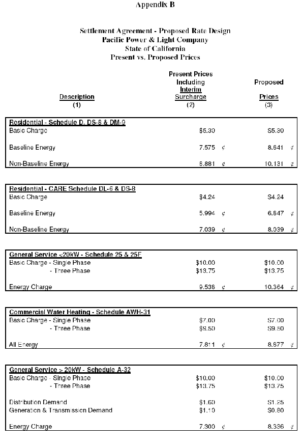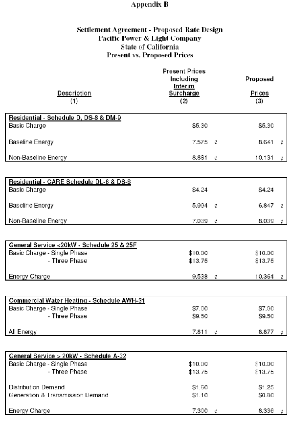 2.5 Attached to this Settlement are four exhibits which detail the specific rates and fees resulting from the Settlement. Exhibit 1 is a Table entitled "Determination of Present and Proposed Revenues Distributed by Rate Schedule". Exhibit 2 is a Table entitled "Settlement Agreement - Proposed Rate Design". Exhibit 3 is a Table entitled "Present Revenues, Pacific Power & Light Company, State of California, Billing Determinants for Present Prices". Exhibit 4 contains two revised pages from Schedule 300 of the PacifiCorp tariff, containing revised service fees and tariff provisions.