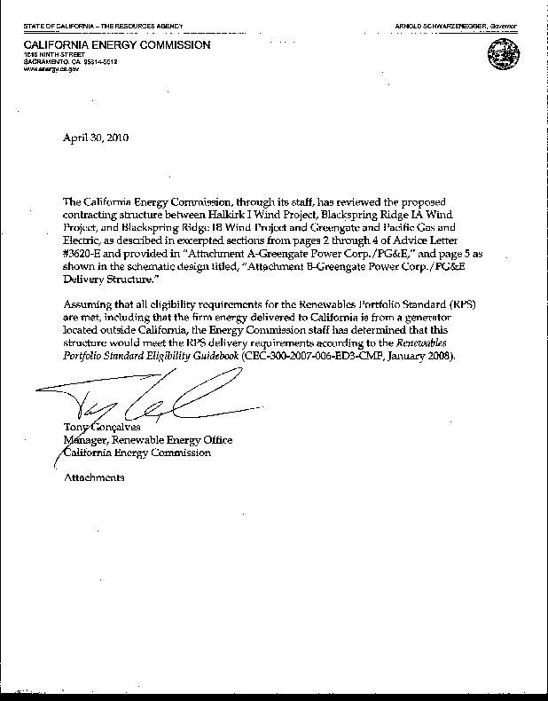 California Energy Commission Letter Regarding Eligibility of the PG&E and Greengate Contracts' Delivery Structure