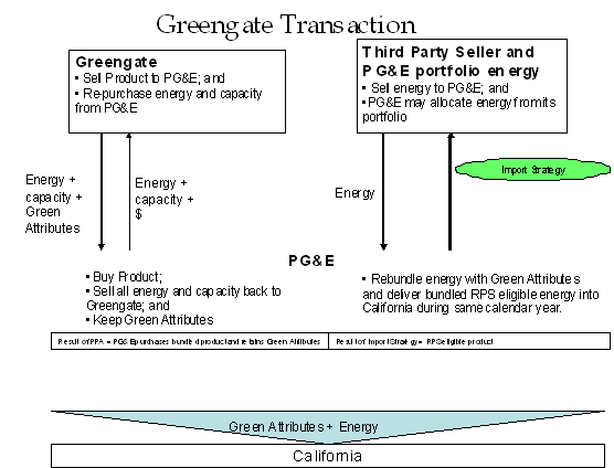As explained above, pursuant to the Greengate contracts PG&E will purchase energy, capacity and Green Attributes at each project's busbar and immediately and continuously resell the energy and capacity back to Greengate at the project busbar while retaining the Green Attributes for its own use. PG&E will then purchase energy at a CAISO import point(s) (e.g., COB); rebundle an equivalent volume of import energy with the Green Attributes purchased under the contracts; and import the bundled RPS-eligible energy into California during the same calendar year and over the 20-year contract term. Deliveries of import energy will be documented with a North American Electric Reliability Corporation (NERC) E-tag that relates import energy deliveries to generated energy from the Greengate projects.