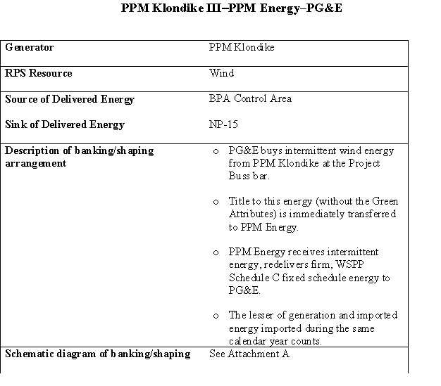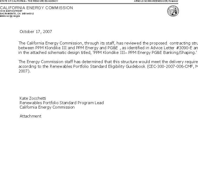 On July 20, 2007, PG&E filed Advice Letter (AL) 3090-E requesting Commission approval of a renewable procurement contract between PG&E and PPM Klondike III Wind Power (Klondike). On August 10, 2007, PG&E filed Supplemental AL 3090-E-A to include the Independent Evaluator's Report for PG&E's 2006 RPS Solicitation. The PPA includes a shaping and firming agreement with PPM Energy, Inc. (PPM) The PPA results from PG&E's 2006 RPS solicitation which was authorized by D.06-05-039 on May 25, 2006. The Commission's approval of the PPA will authorize PG&E to accept future deliveries of incremental supplies of renewable resources and contribute towards the 20 percent renewables procurement goal required by California's RPS statute.18 On August 1, 2007, PG&E reported its IPT for 2006 as 727 GWh.19 With the approval of this PPA, PG&E will have contracted for 265 GWh towards that target.