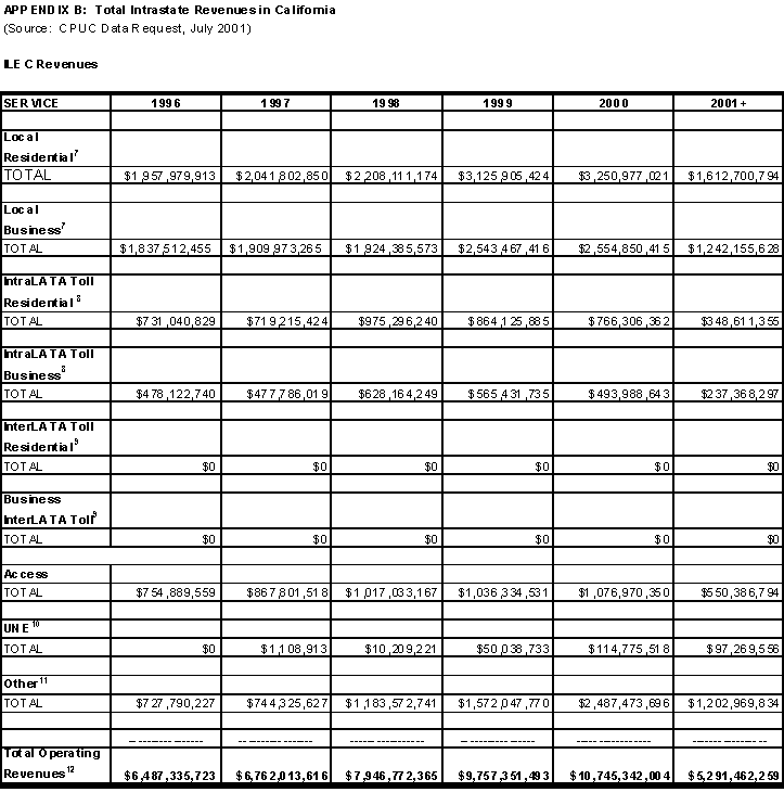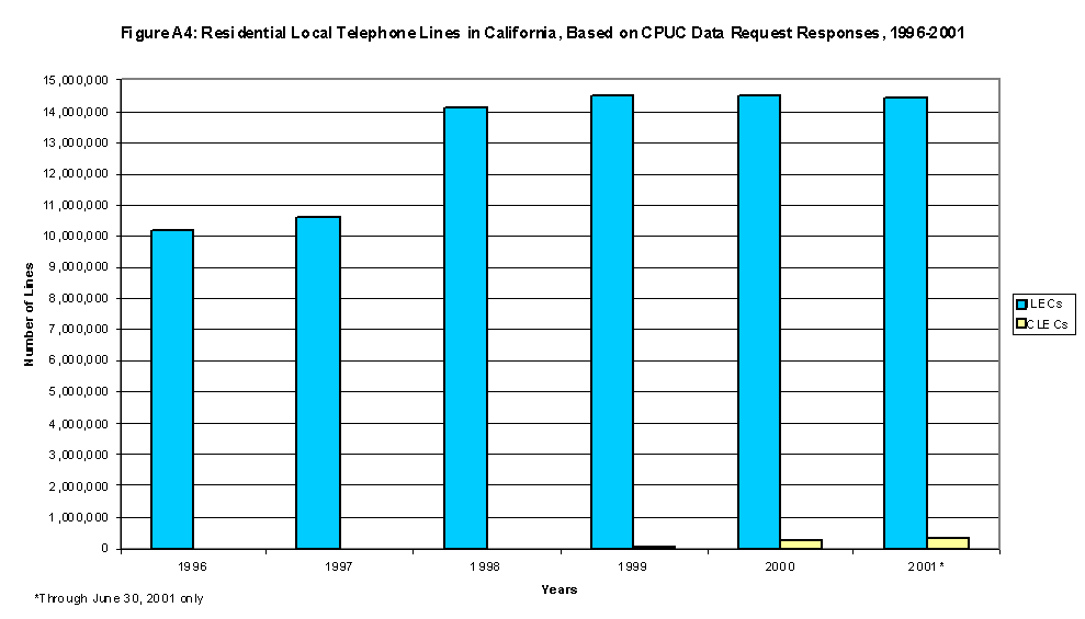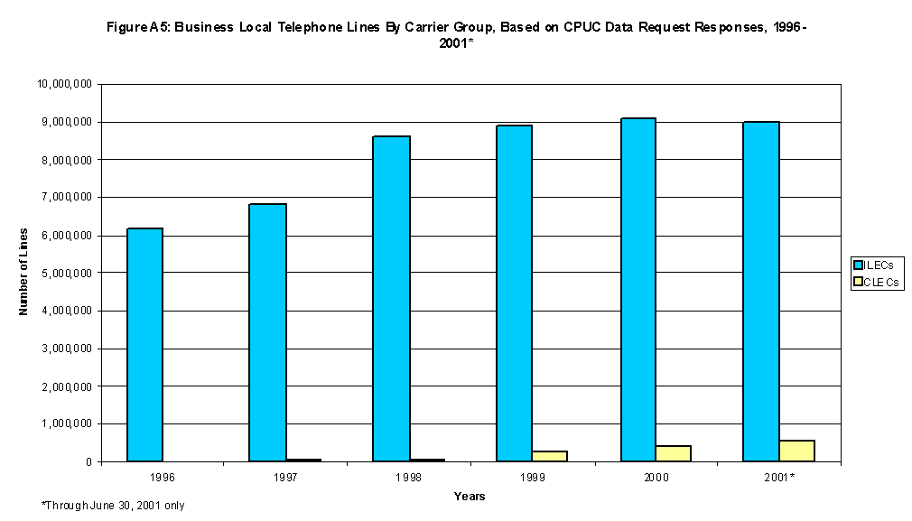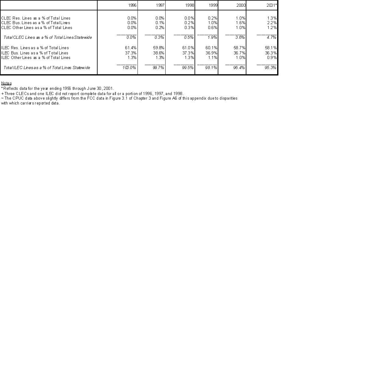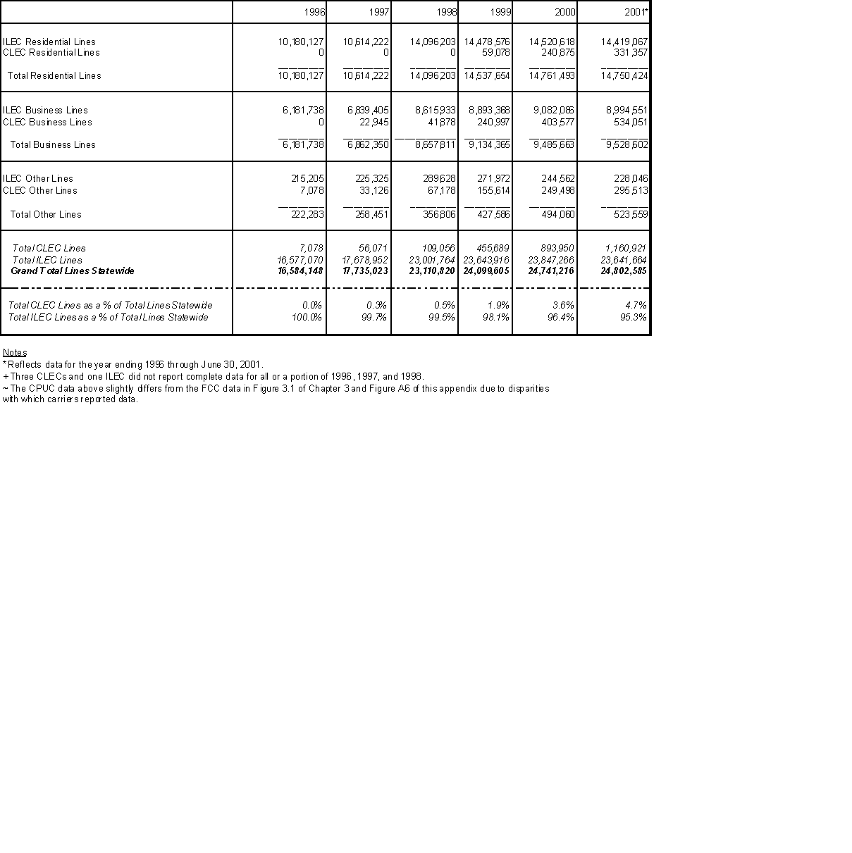 Figure A1: Total California Local Telephone Lines, Based on CPUC Data Request Responses, 1996-2001*+~