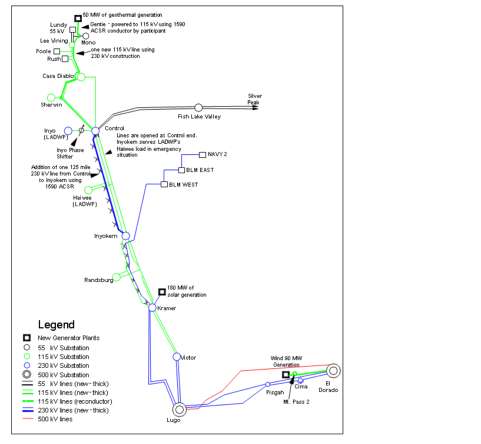 The area is served by SCE. The electrical hub is the Lugo Substation, to which terminate eight 500kV and six 230kV transmission lines. From this substation two 500kV and two 230kV transmission lines run east 177 miles to the El Dorado Substation in Nevada. Transmission to the north starts with four 230kV lines and ends with one 115kV line at Lee Vining, just east of Yosemite 278 miles away. New generation connected to the El Dorado Substation would not require additional lines for transmission to Los Angeles, but new generation connected in the north would require considerable upgrades described below.
