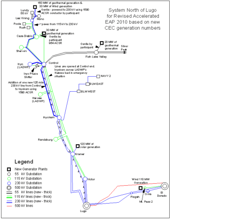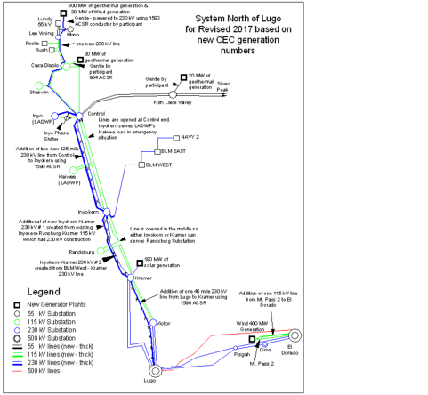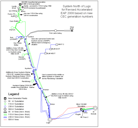The following planned phases identified by the SCE Conceptual Transmission study would be interconnected to the Kramer substation, which could interconnect 100MWs in 2003 without any new facilities (other than work in the Kramer Substation). The other phased additions need further analysis covered in a System Impact Study, which may need the additional 500kV transmission lines to Los Angeles Basin in 2002 CAISO Annual Assessment. Facility upgrades indicate new 230kV lines connecting Lugo and Kramer substation are needed to deliver the renewables to the load centers as well. The Conceptual Study identified there are licensing and environmental requirements and limitations for the new lines right of ways and substation sites.