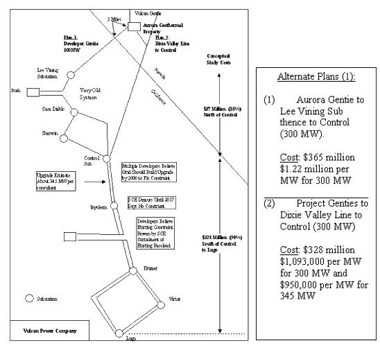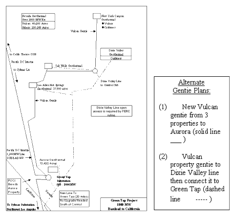 Vulcan also proposed 240 MW of its near border Nevada geothermal power to SCE in response to recent renewable-only RFP after LADWP generation group managers delayed for nearly two years. Vulcan has also notified Caithness, a geothermal developer in Dixie Valley, Nevada and owner of the Dixie Valley Line that the companies might cooperatively deliver new power to California utilities across the Vulcan Aurora Green Tap substation and jointly utilize the Dixie Valley Line as a gentie to mutual benefit.