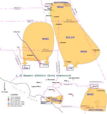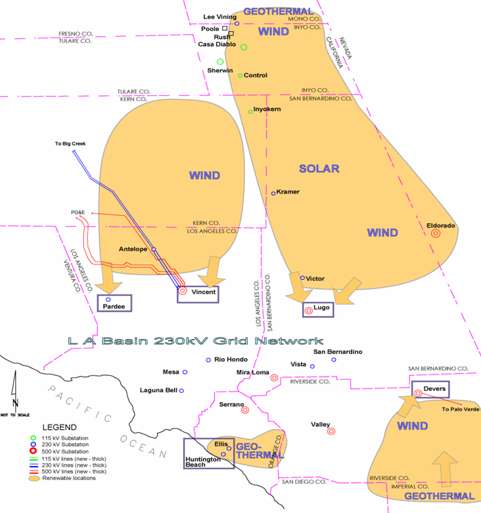 The area is served by three utilities: SCE, SDG&E and the Imperial Irrigation District (IID). The renewable resources in Imperial County would be connected to the IID network. It is not now known whether this generation would serve IID customers or be transmitted to SCE or to SDG&E or a combination of the foregoing. Therefore, the simplifying assumption was made that all the power would be delivered to SCE's Devers Substation, initially from IID's Coachella Substation and subsequently from a new substation arbitrarily designated "Geo".