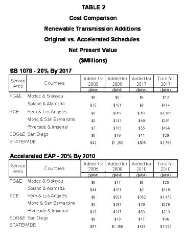 The development of the transmission is shown on Figures 3-1 and 3-2 for the years 2008 and 2017 under the SB 1078 development schedule and Figure 3-3 for the year 2010 under the EAP accelerated schedule. The transmission additions are tabulated for each year with corresponding costs on Table 3-A, with costs in 2003 dollars, and Tables 3-B and 3-C with net present value costs for the SB1078 schedule and the EAP accelerated schedule, respectively.