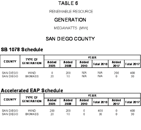 The renewable resources identified by the CEC in the area consist of wind and biomass in eastern San Diego County as shown in Maps 6-A and 6-B. The generation capacity of these resources and the dates they could come on line are tabulated in Table 6.