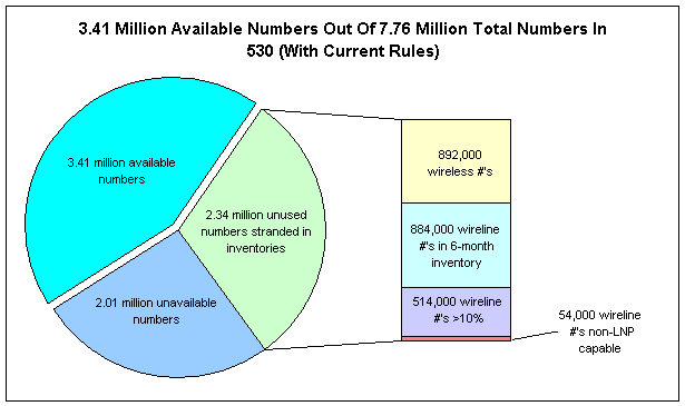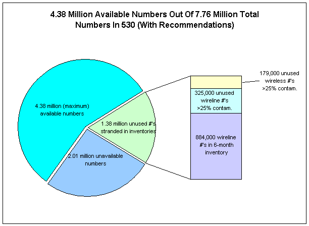 At the same time, the 530 study finds that under FCC rules about 2.34 million numbers cannot be contributed to the 530 number lottery, nor can they be contributed to the future 530 number pool for reassignment to other companies. The FCC has determined that wireless carriers do not have to participate in number pooling at this time.3 In addition, the FCC has determined that the CPUC may only require wireline carriers to contribute to a number pool those blocks of 1,000 numbers that are 10% or less contaminated,4 meaning those blocks in which only 100 or fewer numbers are unavailable. However, wireline carriers may also keep a portion of the 10% or less contaminated blocks if they need to use those blocks within six months. The study further finds that of the 5.75 million numbers not in use, a maximum of 4.38 million numbers5 could be made available to companies through pooling if a) the companies donated blocks with higher contamination levels to the pool, and b) wireless carriers were required to participate in the 530 number pool. The first table below illustrates the current distribution of numbers assuming wireline pooling at 10% contamination. The second table shows the distribution that would occur if all the recommendations in this report were implemented.