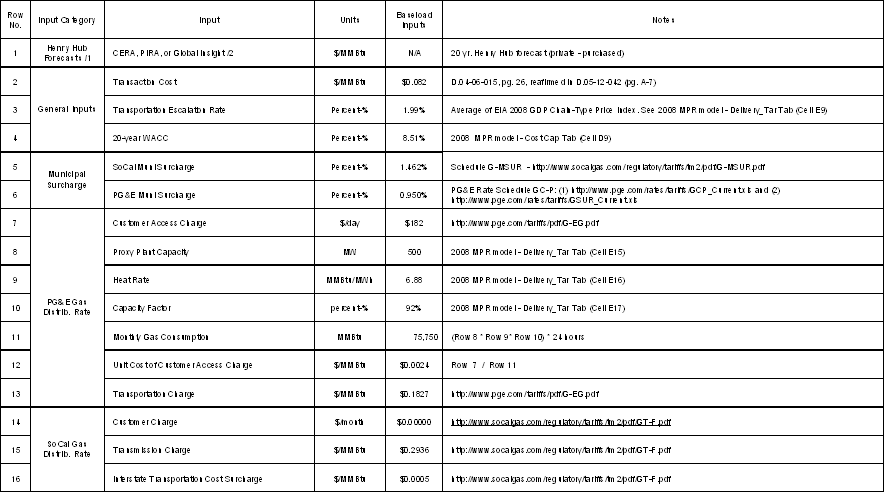 The 2008 MPRs were calculated using the "MPR model", which is based on a cash-flow simulation methodology approved by the Commission.14 The MPR model requires several types of input data, including natural gas prices, capital costs, operating costs, finance costs, taxes, and power delivery assumptions. The primary input drivers for the MPR calculation are the California (CA) gas price forecast, power plant capital costs, and the capacity factor for a proxy baseload plant. (Refer to 2008 MPR model, tabs; CA_Gas_Forecast, Install_Cap, and CF_Inputs.)