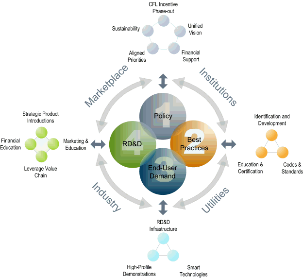 The figure above represents the interconnectedness of the four lighting goals. To achieve the vision for a transformed lighting market in California, all four goals have to work in synergy to continuously define, create, test and deliver advanced lighting products and best practices to an educated pool of end users in a supportive policy environment.