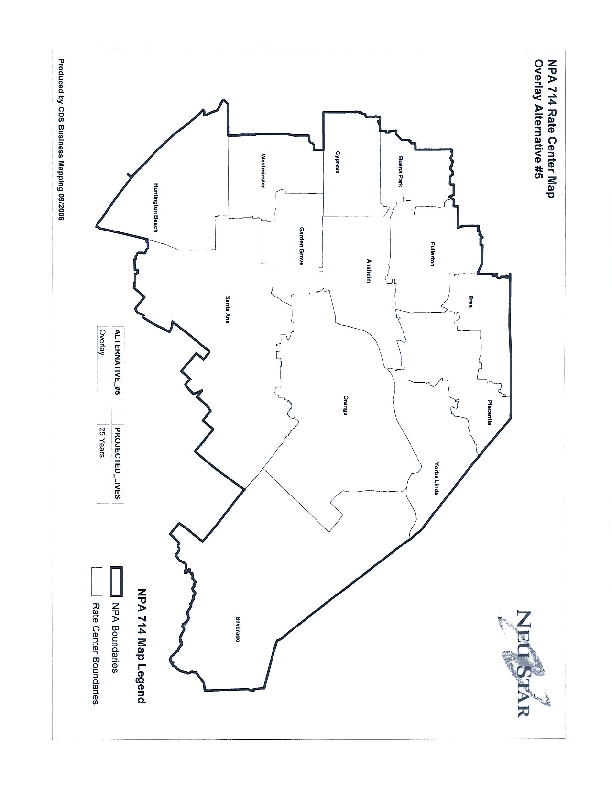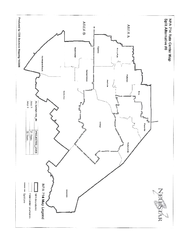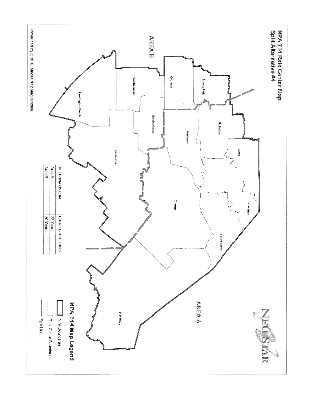 In its application, NANPA stated that it used the October 2006 Number Resource and Utilization Forecast (NRUF) report and NPA Exhaust Analysis for the 714 area code, which concludes that the 714 area code will "exhaust"4 in the fourth quarter 2008. Based on this information, Commission staff requested that NANPA convene an Industry Relief meeting on October 3, 2006 to develop and consider new area code change alternatives, which produced six alternative area code plans. Five of the six alternatives consist of area code "splits," which geographically divide an area code into two or more area codes. In a split, one side of a designated line retains the existing area code, while the other side(s) acquires the new area code(s). The other alternative considered was an all-services overlay. The industry representatives reached consensus to propose the overlay and two of the split options (Split Alternative #4 and Split Alternative #6) for public comment. Descriptions of these three proposed area code change options are presented in Attachment A. A map of the 714/657 area code boundaries is presented in Attachment B.5
