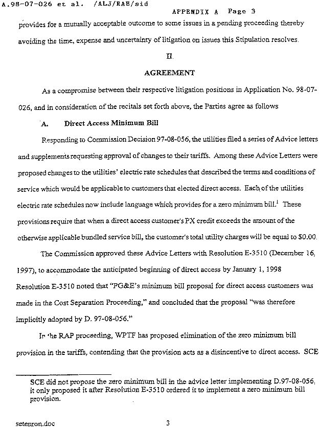 3. SCE and PG&E shall not make any payments of cash to direct access customers or energy service providers to satisfy the customers' Power Exchange credit balance, but shall continue to accrue and track such credits.