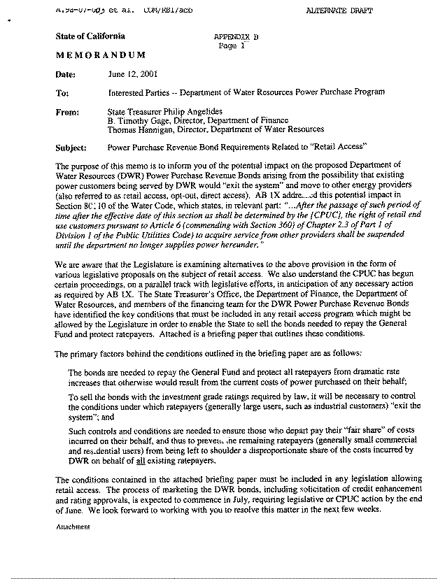 This alternate is being mailed 13 days prior to the Commission's consideration of the ALJ's proposed decision. A reduction of the applicable 14- day period for review and comment under Rules 77.6(d) and 77.7(b) is required in order for the Commission to consider this matter at its June 28, 2001 meeting. Pursuant to Rule 77.7(f)(9), public necessity requires this action, as the public interest in adopting a decision addressing direct access issues at that time in order to address matters relevant to the current energy crisis outweighs the public interest in having the full public review and comment period. Comments are due on June 25 and whenever possible should be served electronically on anw@cpuc.ca.gov. Reply comments may be filed by noon June 27, 2001. Parties in R.94-04-031 and I.94-04-032 may file comments to this draft alternate decision in this docket.