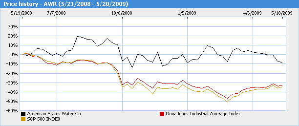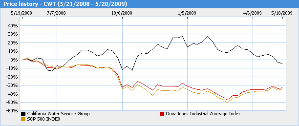 California Water's parent is publicly traded as California Water Service Group (Ticker ID CWT). The following publicly available chart shows CWT's recent trend compared to the Dow Jones Industrial Average15 (Ticker ID DJI) and the Standard and Poor's 50016 (S&P 500) Ticker ID GSPC). The chart shows that over a recent 12-month period, the market price for California Water Service Group suffered a significantly smaller loss in value. For example, by May of 2009 the chart shows that California Water Service Group had lost value only for short periods of time, whereas both the Dow Jones Industrial Average and the Standard and Poor's 500 had lost up to 50% of their value and by May 2009.has still lost over 30% in value.17