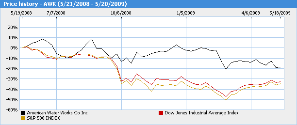 American Water Works Inc. (Ticker ID AWK) is the parent of California American and is publicly traded. The following chart shows AWK's recent trend compared to the Dow Jones Industrial Average and the Standard and Poor's 500. The chart shows that over approximately the past 12 months the market price for American Water Works Inc. suffered a significantly smaller loss in value. For example, in March of 2009 the chart shows that American Water Works Inc. had lost 20% in value whereas both the Dow Jones Industrial Average and the Standard and Poor's 500 lost approximately 50% in value. By May, American Water Works Inc, had still lost 20% while the two indices had recovered slightly but were still showing a loss of 305 in value.18