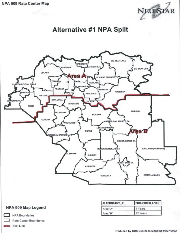 1. The proposed geographic split for the 909 Numbering Plan Area (NPA), identified as Alternative #1, as presented by the North American Numbering Plan Administrator (NANPA) is hereby approved. The geographic boundaries and rate centers to be assigned to the new area codes are as designated in Appendix A.