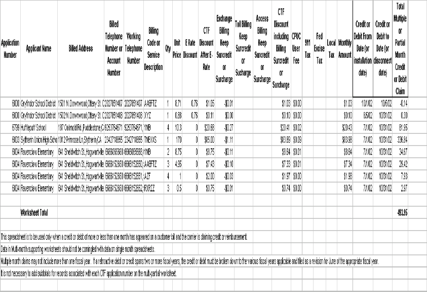 The new worksheet as described in the Guide Section A and shown in Section C-2 includes three additional columns for use by carriers submitting permissible multi-month or partial-month claims. These columns are the date the credit or debit starts, the date the credit or debit ends, and the total of the multi or partial-month credit or debit. The columns to the left of these final three columns should be populated identically to a monthly claim. Two of the final three columns designate the period to which the credit or debit is applicable and the last column is the result of the monthly amount multiplied by the days that the credit or debit was applied. If the claim is a credit claim, such as those provided to account for retroactive E-rate credit or a service disconnection - the negative value should be inserted in the final column and not in the first seventeen columns.