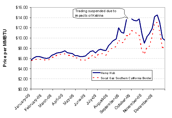 The Henry Hub (HH) spot price of natural gas is the price at which natural gas is traded at the Henry Hub exchange in Louisiana for immediate delivery. The price of natural gas across the country is frequently priced at a differential to the price at the HH. The difference can be positive or negative compared to the HH price depending on market conditions in various regions. Historically, California border prices have been mostly comparable to the HH price, however, during 2005, the California price has been significantly lower than the HH price. (During the energy crisis of 2001, California border prices were significantly higher than the HH prices.)