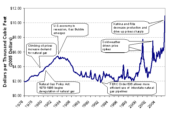 The last factor is a major cause of recent and current high prices. Hurricanes Katrina, Rita, and Wilma have impacted natural gas production in the U.S. significantly. Never in the history of hurricane seasons have hurricanes disrupted natural gas production to this extent. In 2005, the hurricanes followed an abnormally warm summer (which caused prices to escalate due to high gas use for electricity production), and severely exacerbated the already tight natural gas supply-demand balance by removing more than 10 Bcfd of production. This is roughly 20 percent of the natural gas produced in the entire U.S. and caused the price of natural gas to dramatically increase in the weeks after the hurricanes. However, even though some Gulf production continues to remain off-line, adequate natural gas storage availability and warm weather have contributed to the price of natural gas dropping back to levels prior to the hurricanes ranging between $8 to $10 per Mcf. Normally, in the past, such disruptions due to hurricanes have caused price spikes but conditions have returned to normal within two to four weeks of the event. However, the damage caused by the hurricanes this season has followed a different trend. It is anticipated that the impact of the hurricanes may last over a longer period of time, as much as one year.