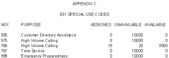 Special Use NXX Codes: Certain NXX codes have traditionally been reserved or designated for special uses, and have not been available for assignment by carriers for general commercial use in providing telephone numbers to customers. These NXX prefixes are restricted to such special uses as recorded public information announcements of time-of-day and weather forecasts, high-volume call-in numbers, and emergency access numbers used by the Federal Emergency Management Administration (FEMA), etc.