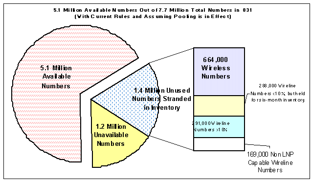 TD's analysis shows that 4.6 million out of the 6.5 million available numbers are available from the Code Administration, and none have been set aside for donation to the future 831 number pool.2 Therefore, companies possess approximately 1.9 million numbers. Wireline carriers such as Pacific Bell and many competitive local exchange carriers hold roughly 1.2 million available numbers while wireless and Type 1 carriers have approximately 700,000 available numbers. At the same time, the 831 study finds about 1.4 million of the numbers held by companies cannot be contributed to the future 831 number pool for reassignment to other companies because the FCC has determined that wireless carriers do not have to participate in number pools at this time.3