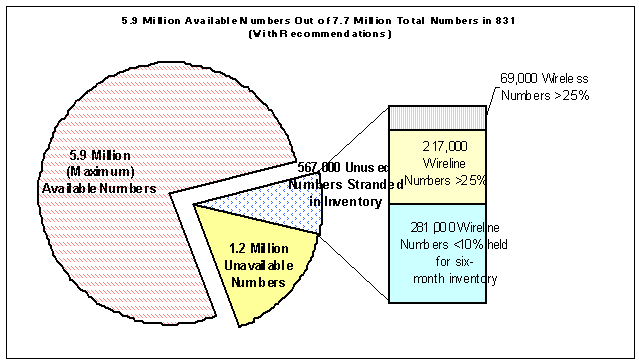 Also, the study concluded that about 5.9 million out of the 6.5 million numbers that are not in use could be made available to companies through pooling if (a) the companies were required to donate blocks with higher contamination levels to the future pool, and (b) wireless carriers were required to participate in the 831 number pool. The first table below illustrates the current distribution of numbers. The second table shows the distribution that would occur if all the recommendations in this report were implemented.